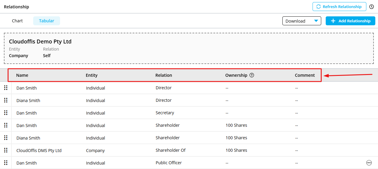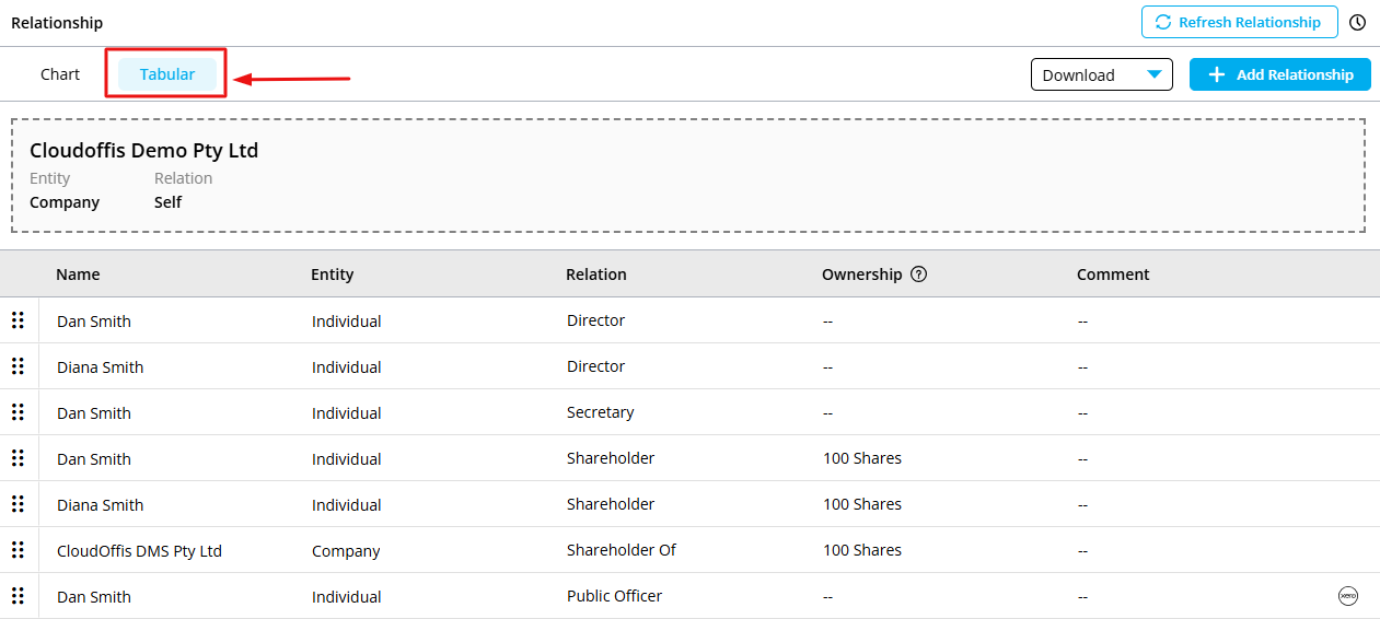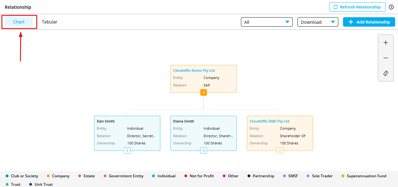 Step 5: You can view the Relationship, Entity Type and Ownership of the trustees in the table given alongside the Relationship Chart.
