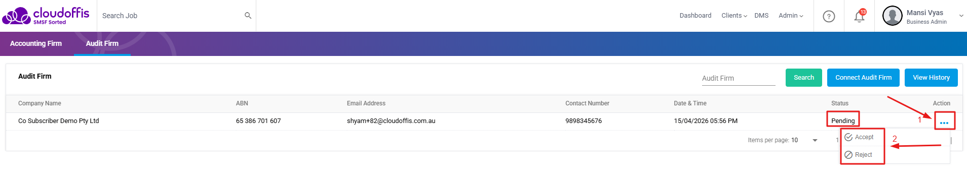 Note:- If the accounting firm already has a Cloudoffis Audit portal, the Company Name, Email Contact, and Firm Type will be prefilled after the ABN has been entered.