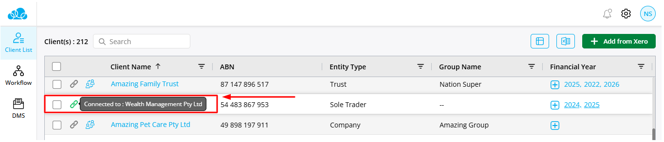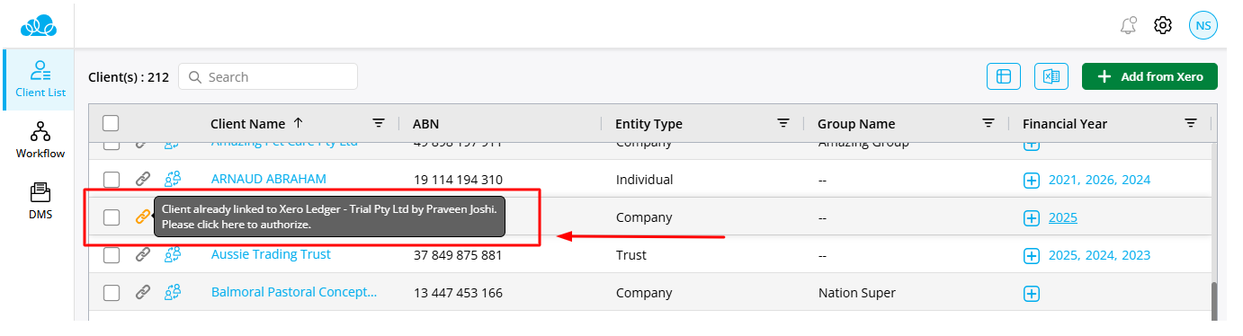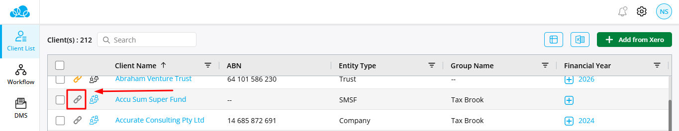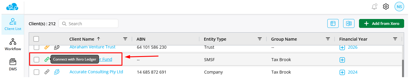 Step 1: From the Client List, find the client you want to connect with and click on the Connect with Xero Ledger icon next to their name.