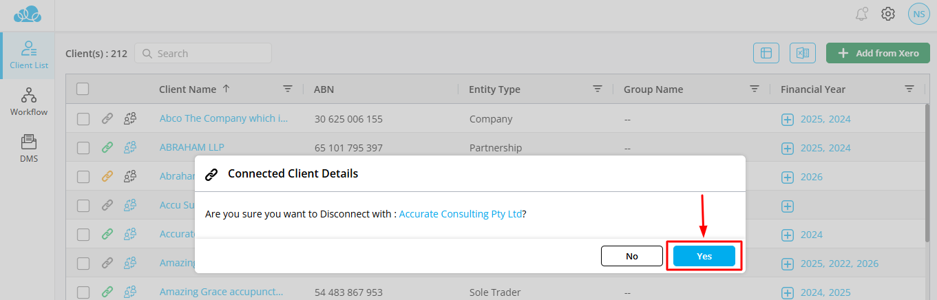 Step 1: From the Client List find the client you want to disconnect from Xero Ledger.