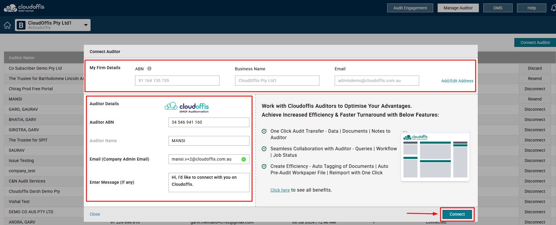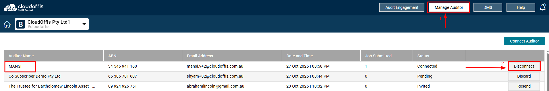As soon as they click on Accept, they will be connected and will be visible in your Auditor's list on Manage Auditor's page. From this page, you can also click on Disconnect to disconnect with your auditor.