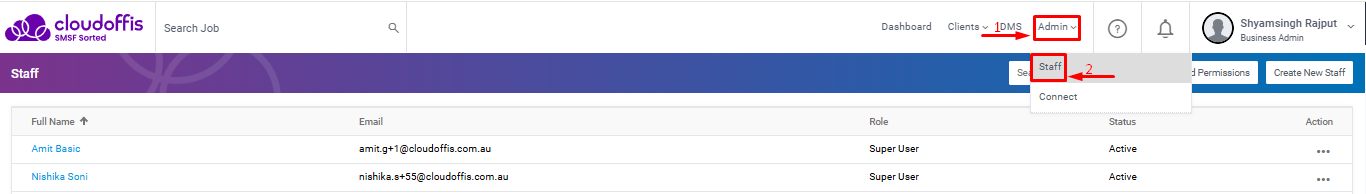 Step 1: Login to your SMSF Sorted portal and click on Admin > Staff.
