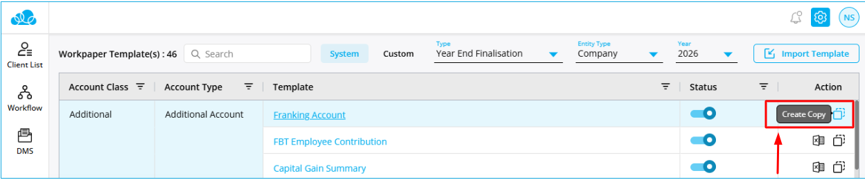 Step 2: Search for the workpaper template you want to clone from the list and click on Create Copy.