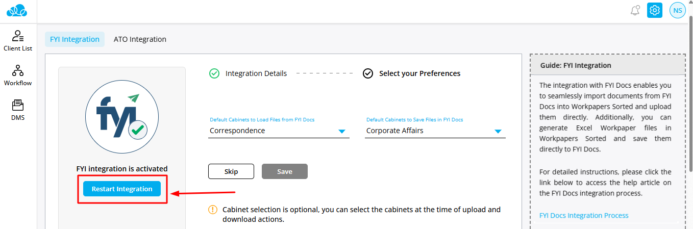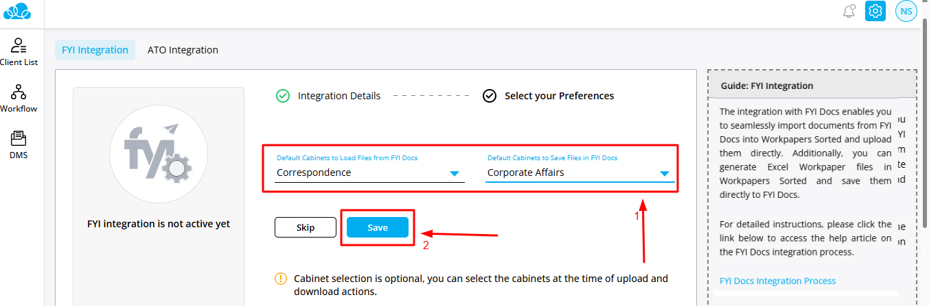 - Selection of Default Cabinets to load file(s) from FYI Docs is not mandatory. You can choose the Cabinet at the time of loading files from FYI Docs or saving files into FYI Docs. You can skip this part by clicking on the Skip button.