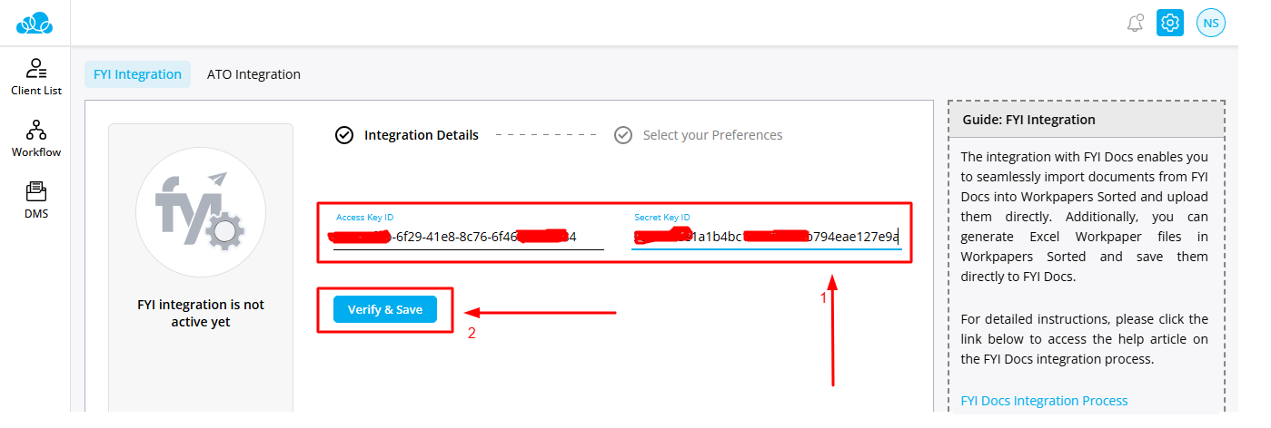 Step 2:- Enter the Access Key ID and Secret Key ID of your FYI account. Once the details are entered click on the Verify & Save button.