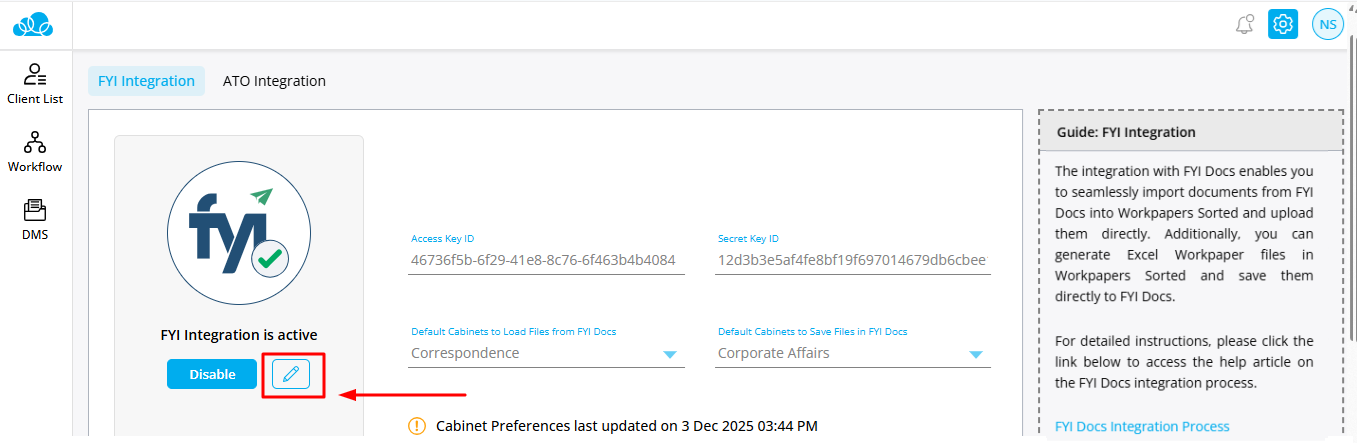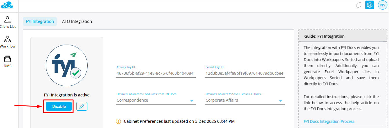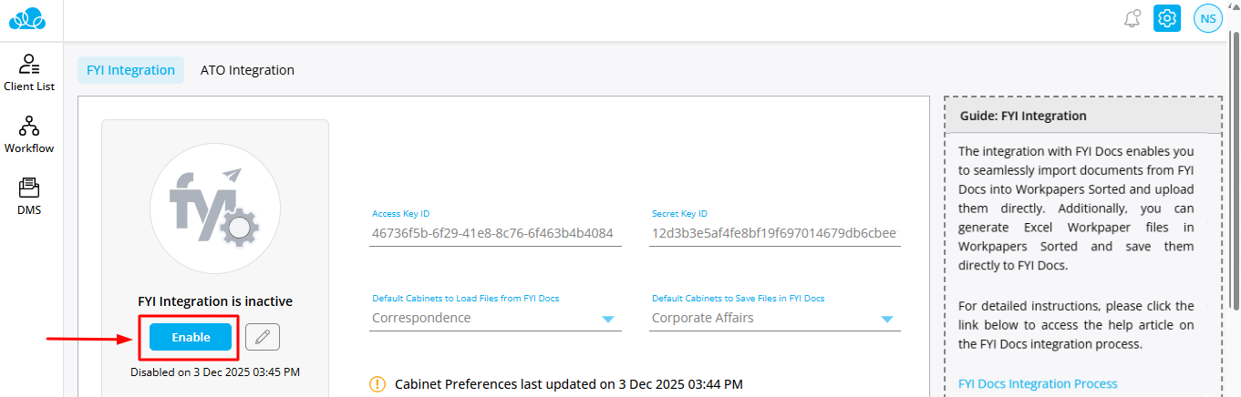 Step 4: The Client ID and Secret Key on your screen will be displayed, you can select the cabinet at this stage. Enter these details while configuring FYI in Workpapers Sorted.