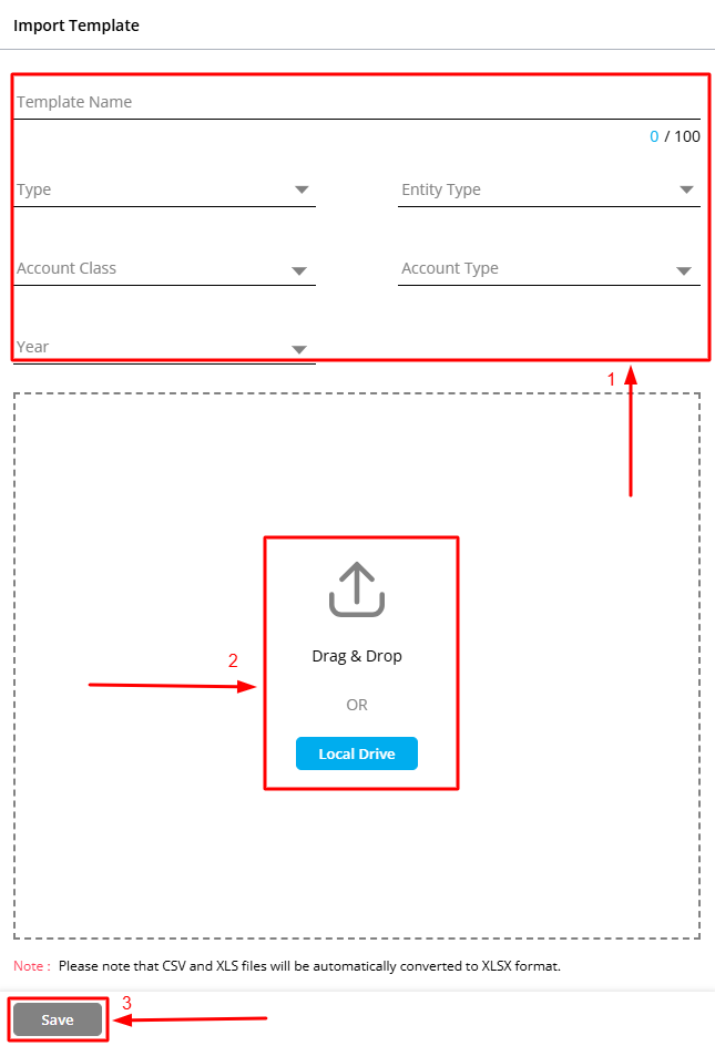 Step 2: Now click on Import Template. Add Template Name, Account Class, Account Type and Year.