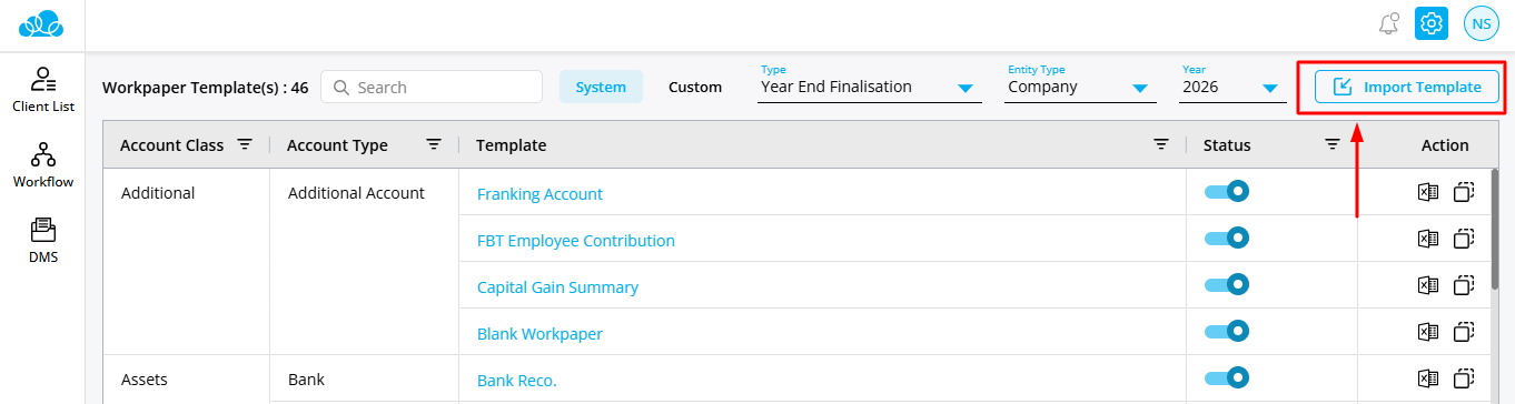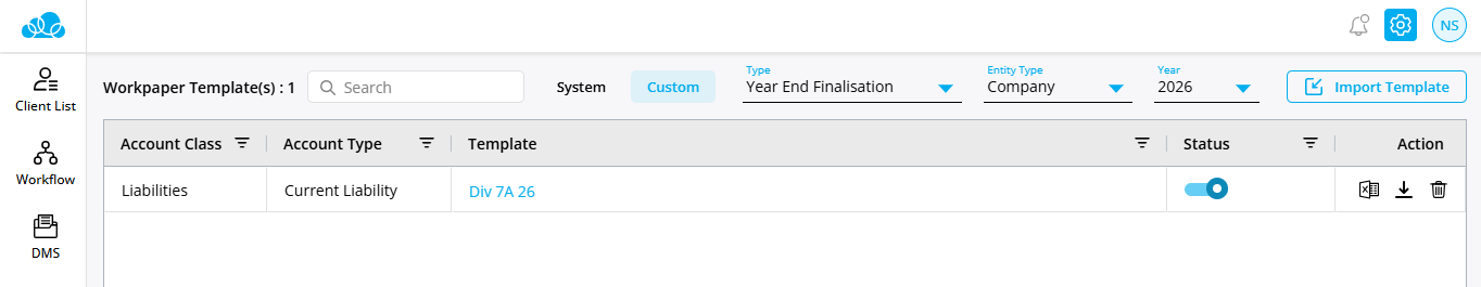 Step 5: Once the document has been successfully uploaded, the imported template will be listed under the Custom tab of the Workpaper Template.