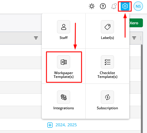 Step 1: Start by logging in and clicking on Settings icon top right and then on Workpaper Templates.