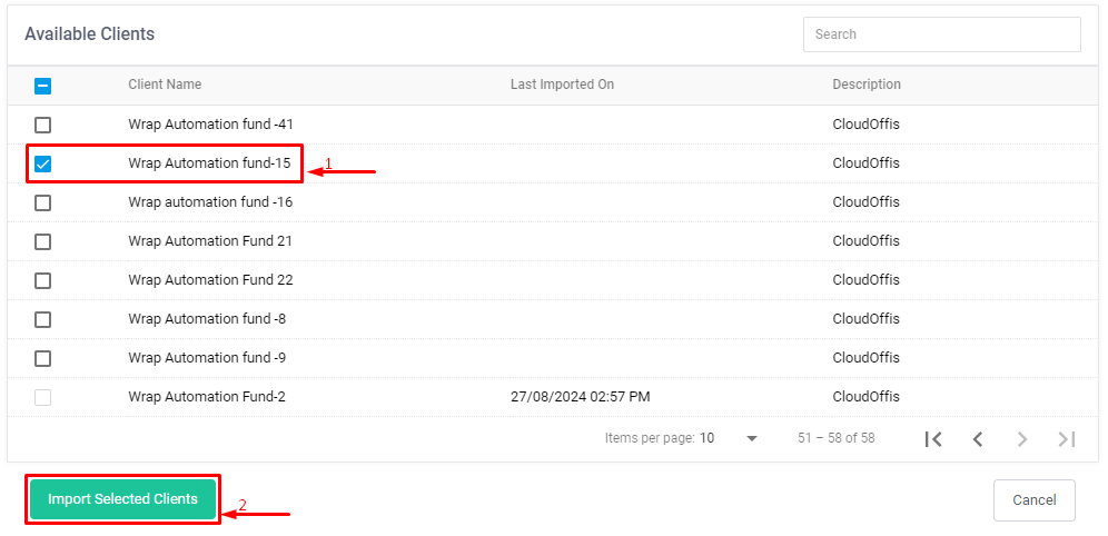Step 5: Select the funds that you want to import by clicking on the checkbox alongside the Client Name.