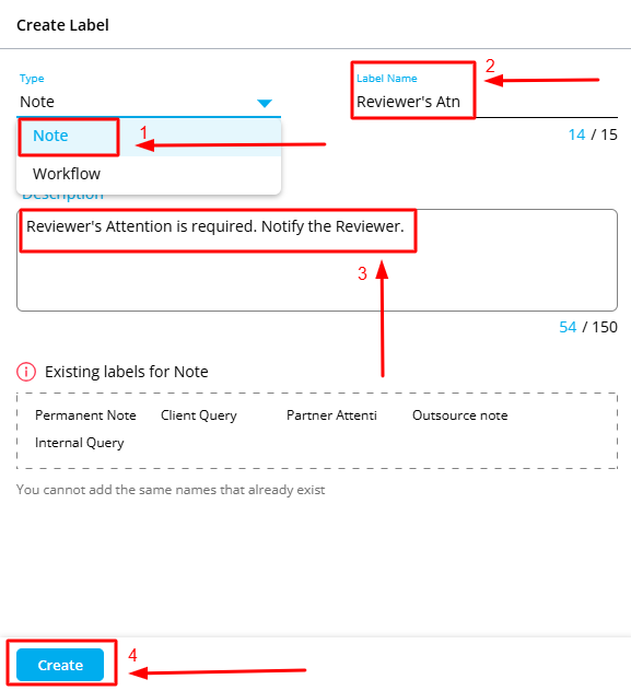 Step 3: Select the Type as Note , enter Label Name ,followed by adding the Description, and click on Create.