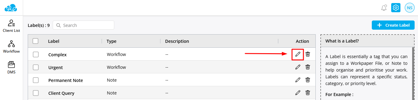 Step 2: Now, alongside every existing label, you'll have an edit icon visible under action column. Click on the Edit icon.
