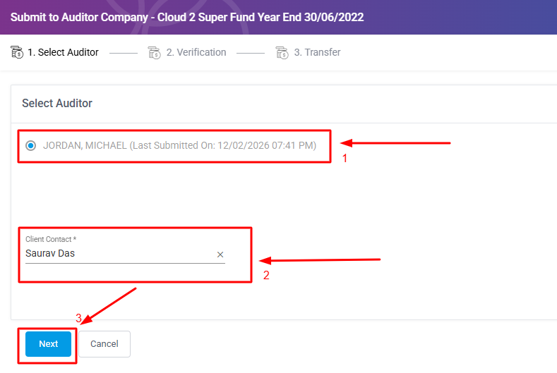 Step 4: Now select the connected Auditor and Client Contact, then click on Next.