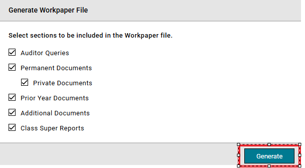 Step 4: You can choose the items you want to include in the workpaper file and generate it by clicking on the Generate button.