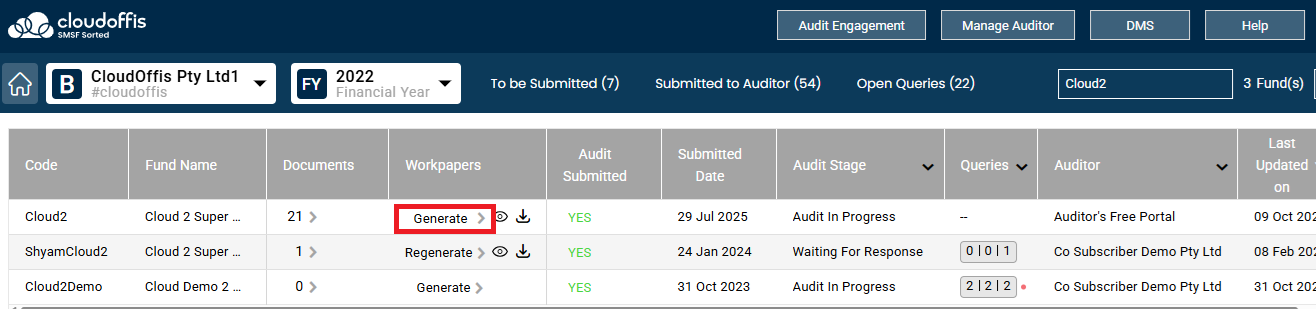 Step 3: Search the fund and click on the Generate workpapers.