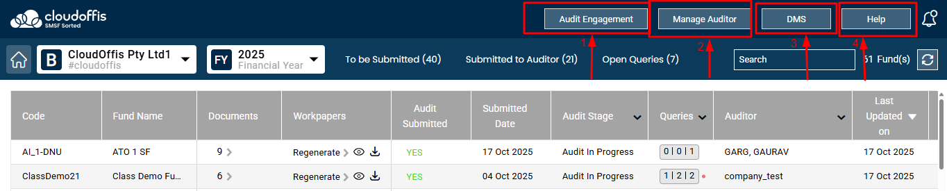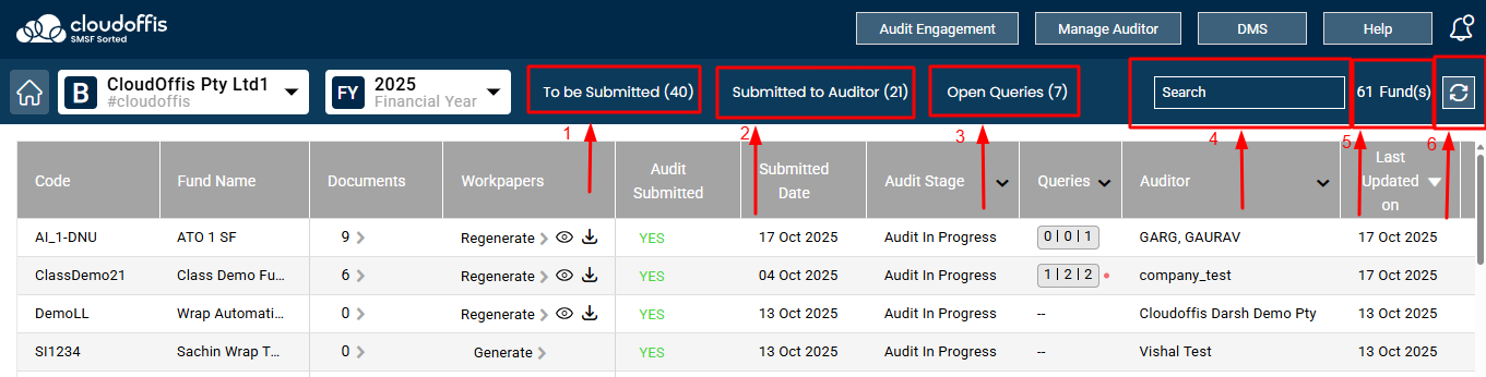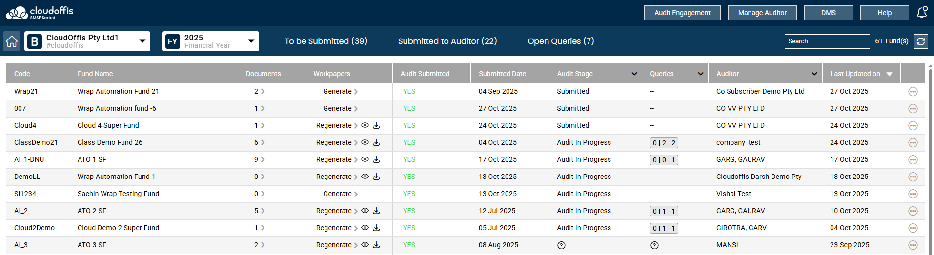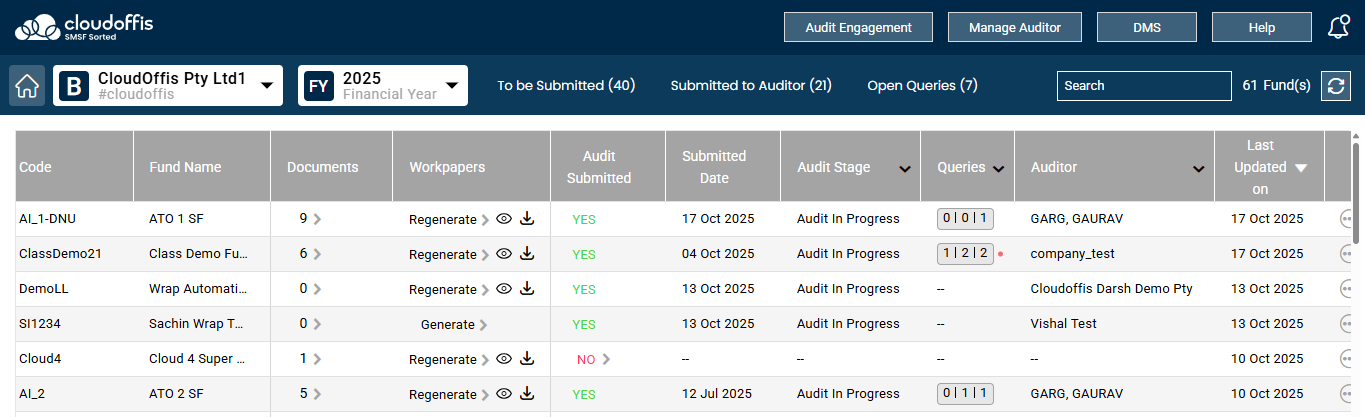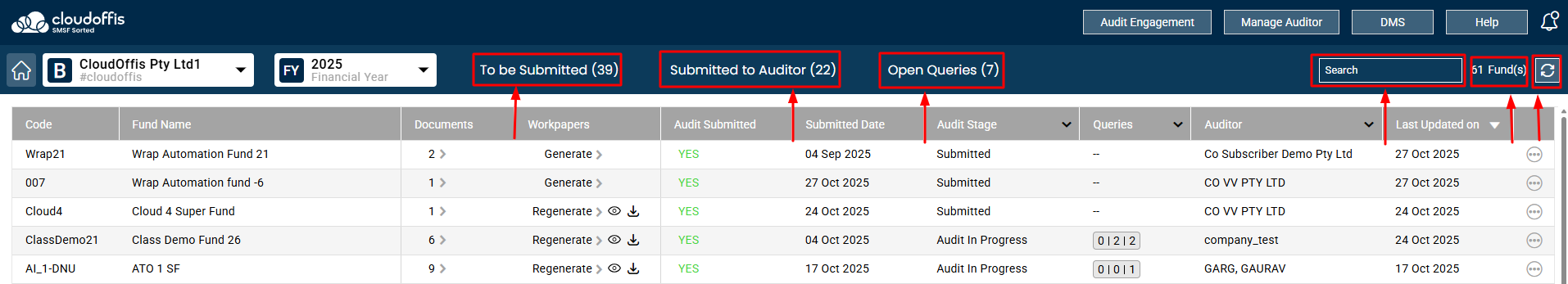 - Audit Stage: Shows the current audit stage for each fund(if the fund is submitted to the auditor who uses Cloudoffis Auditomation for conducting their audits).