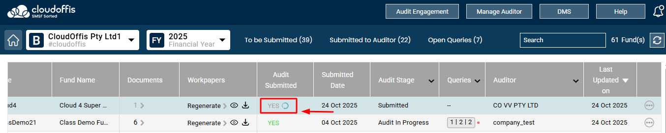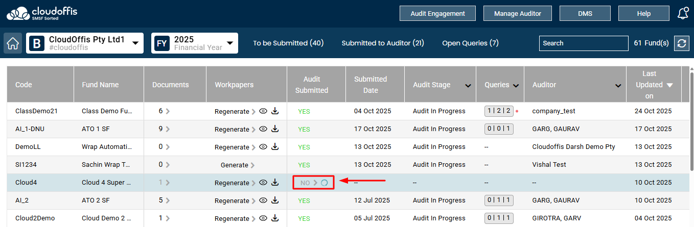 Step 5: There will be a loading icon denoting the Audit Submission is still in progress. Once done, the NO icon will change to YES after automatic refresh.
