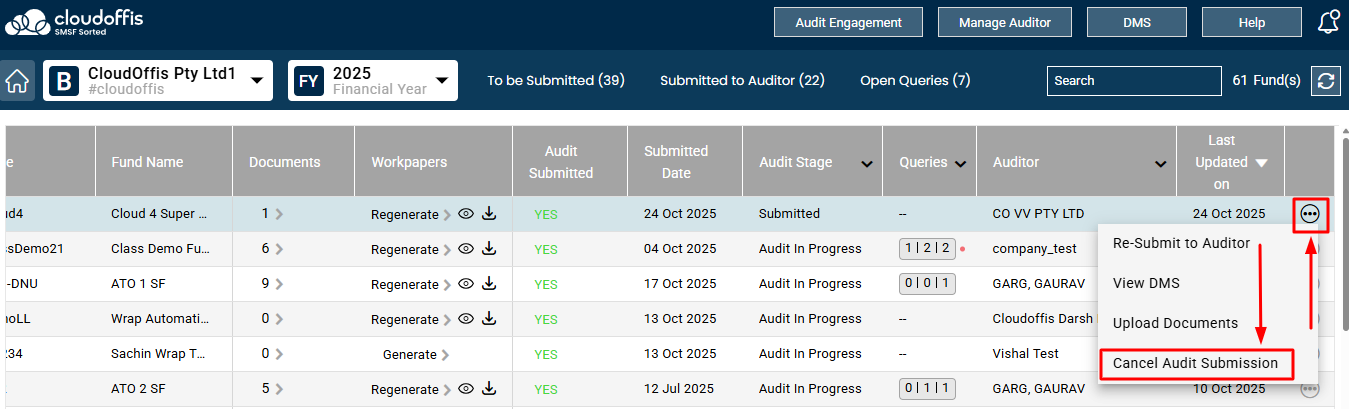 Step 2: Click on the 3-dot icon (ellipsis) from the action column and click on Cancel Audit Submission.