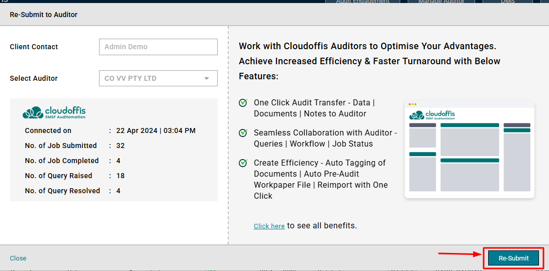 Step 3: A pop-up screen will appear with an auto-filled Client Contact and Auditor that can not be changed, hit Re-submit.