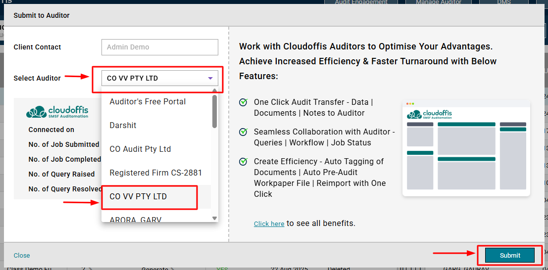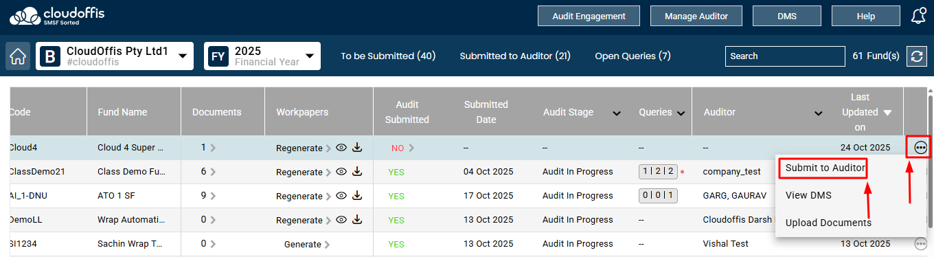 Step 2: Click on the 3-dot icon (ellipsis) from the action column and click on Submit to Auditor.