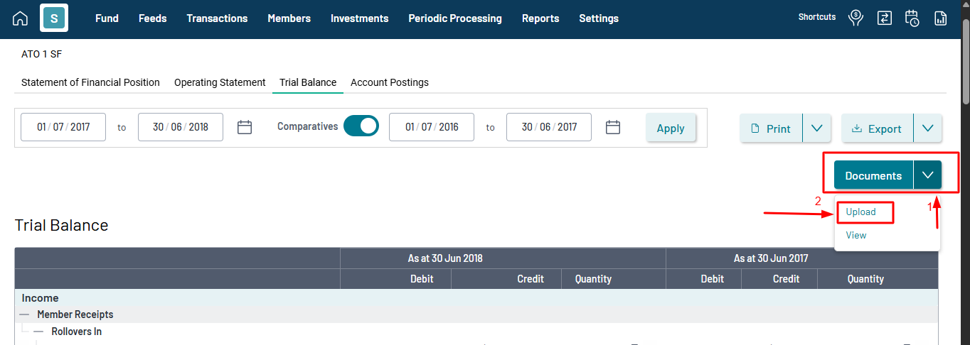 Step 1(Option-4): Login to Class Super, go to Fund > Reports > Trial Balance, and click on the Documents > Upload button.