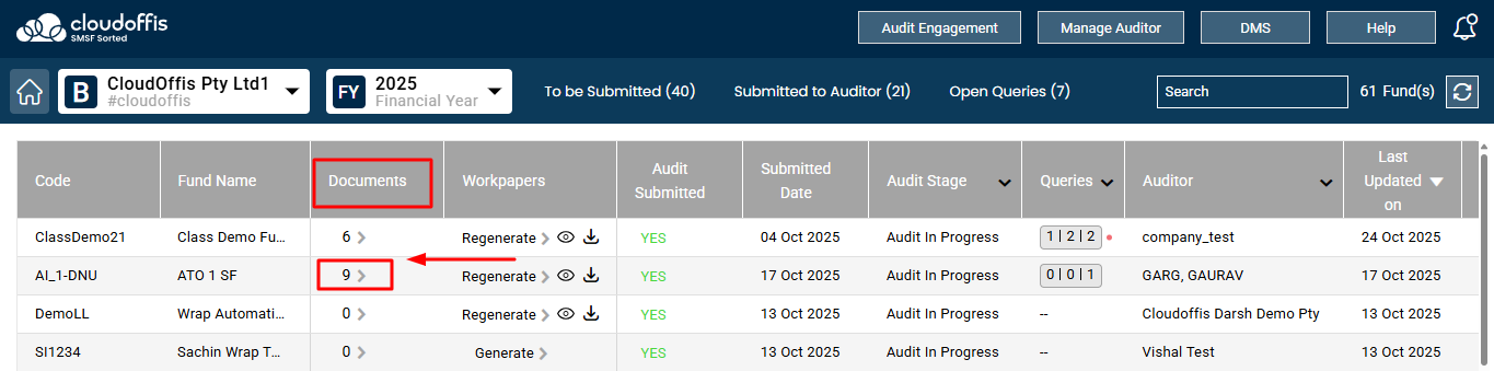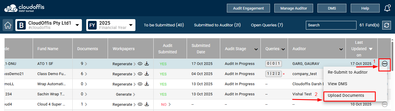 Step 1(Option-3): Go to business-level DMS from the Audit Console page, search for the relevant fund, and then click on the Upload Documents button.