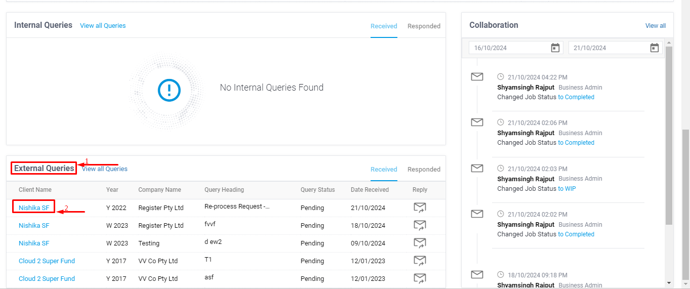 Step 4: Switch between the Internal and Audit Firm tabs. External Queries received from auditors will appear in the Audit Firm tab.